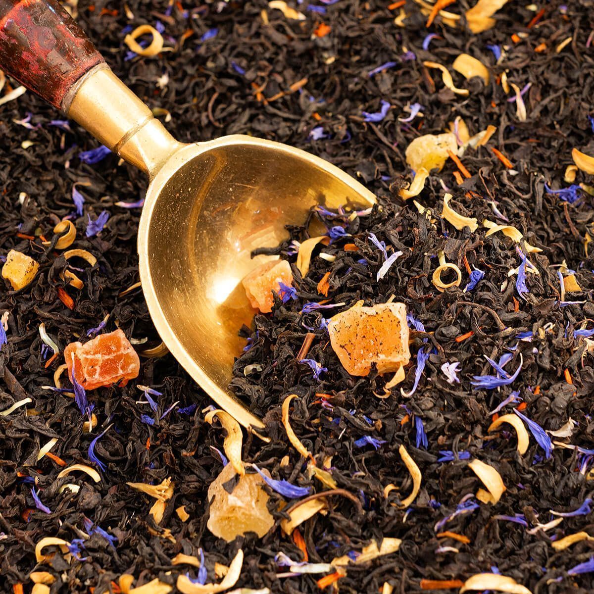 Состав купажа: индийский черный чай Ассам, папайя, манго, цветы апельсинового и сандалового дерева, синий василек.