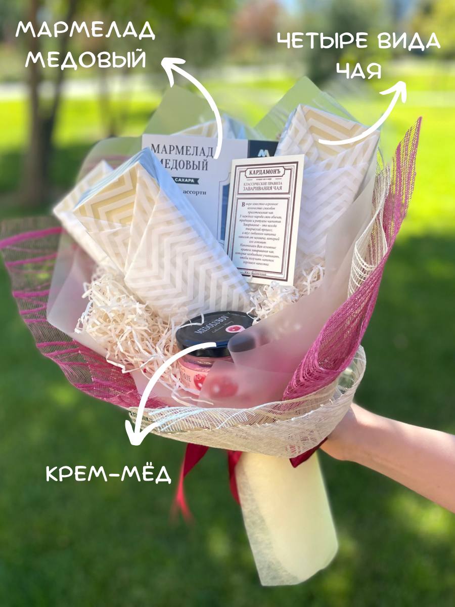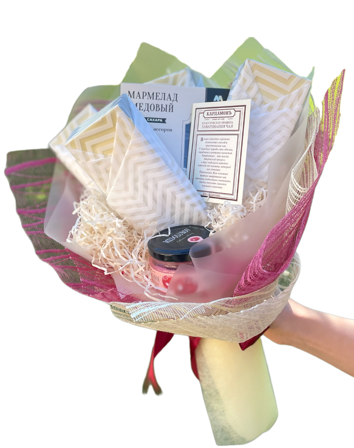 Вся композиция собрана в форме необычного букет, сборка таких подарков - всегда полет вдохновения и фантазии, никогда не могут получиться две идентичные композиции, поэому считаем нужным предупредить, что финальный вид Вашего букета может отличаться от фотографии на сайте. Но обещаем, вам обязательно понравится!