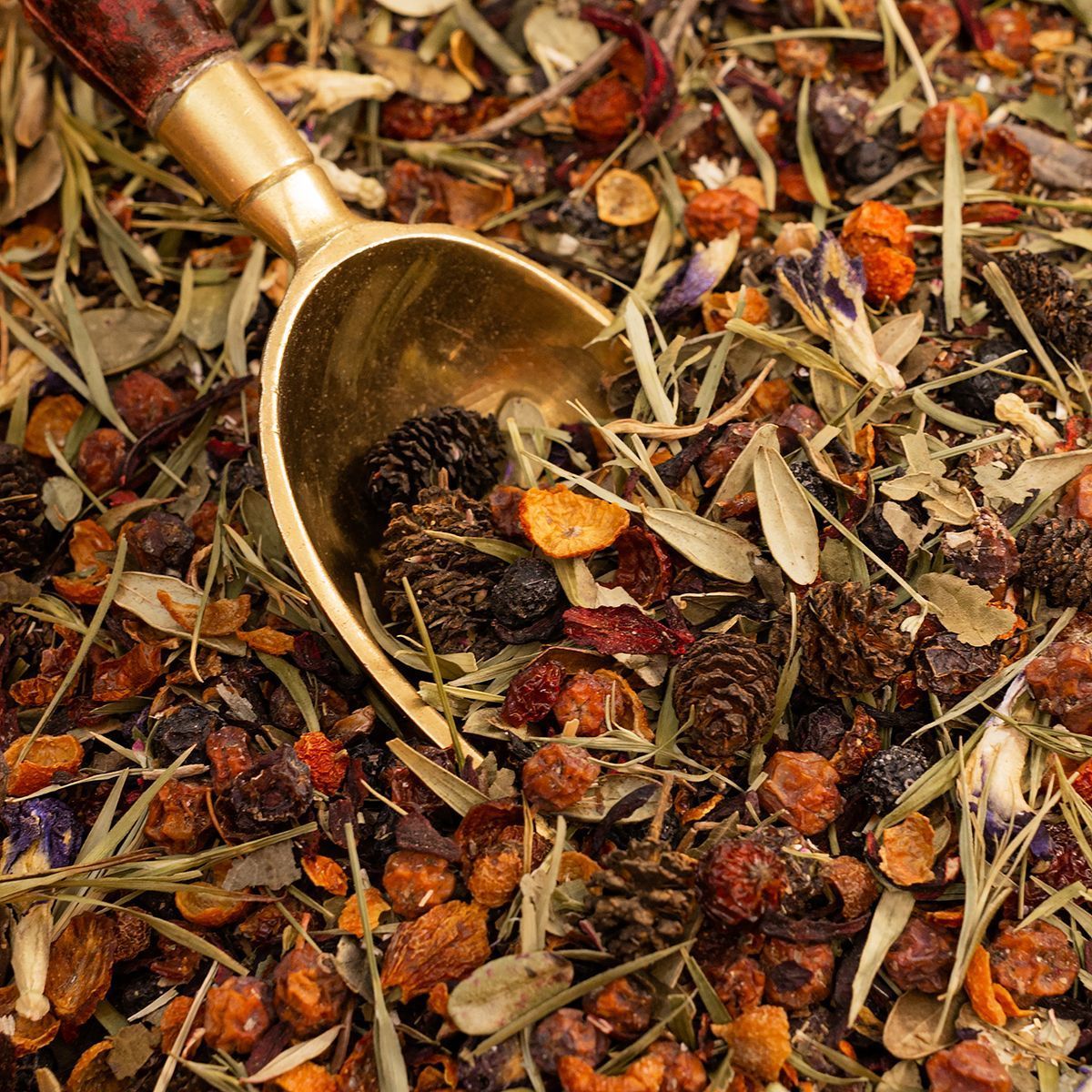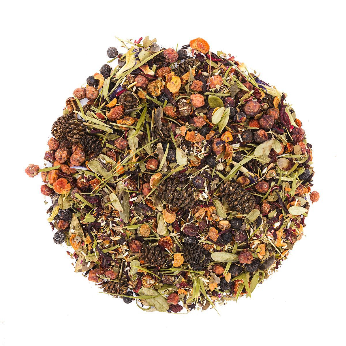 Состав: цветки анчана, рябина красная, плоды шиповника, гибискус, ягоды черёмухи, душица, шишки ольхи, листья бамбука и грецкого ореха, чашелистики морошки, ароматизатор.