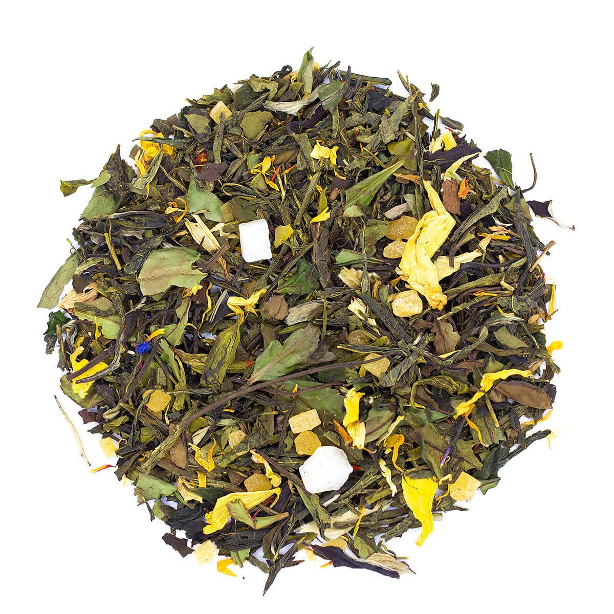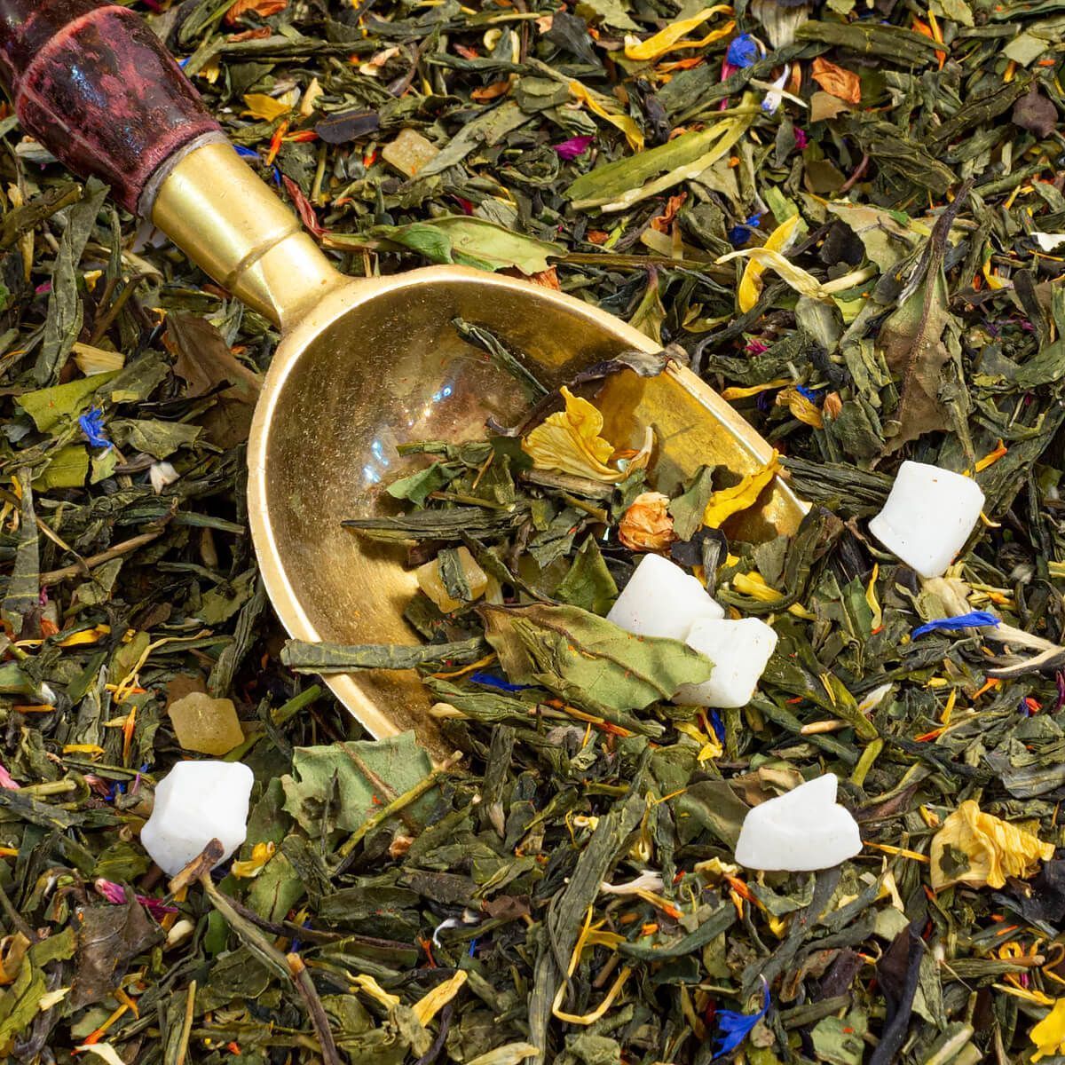 Состав: Сенча, Лун Цзин, Бай Му Дань, кусочки кокоса, лепестки османтуса, василька, жасмина и календулы.