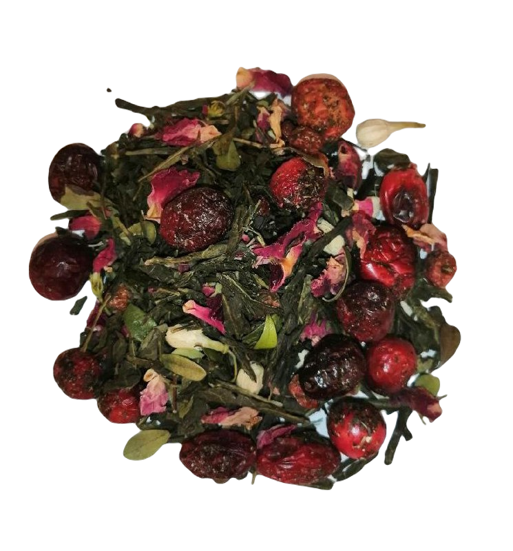 Состав: чай зеленый Сенча, лист брусники, сублимированные ягоды клюквы и красной смородины, цветы жасмина, лепестки розы, медовые гранулы.