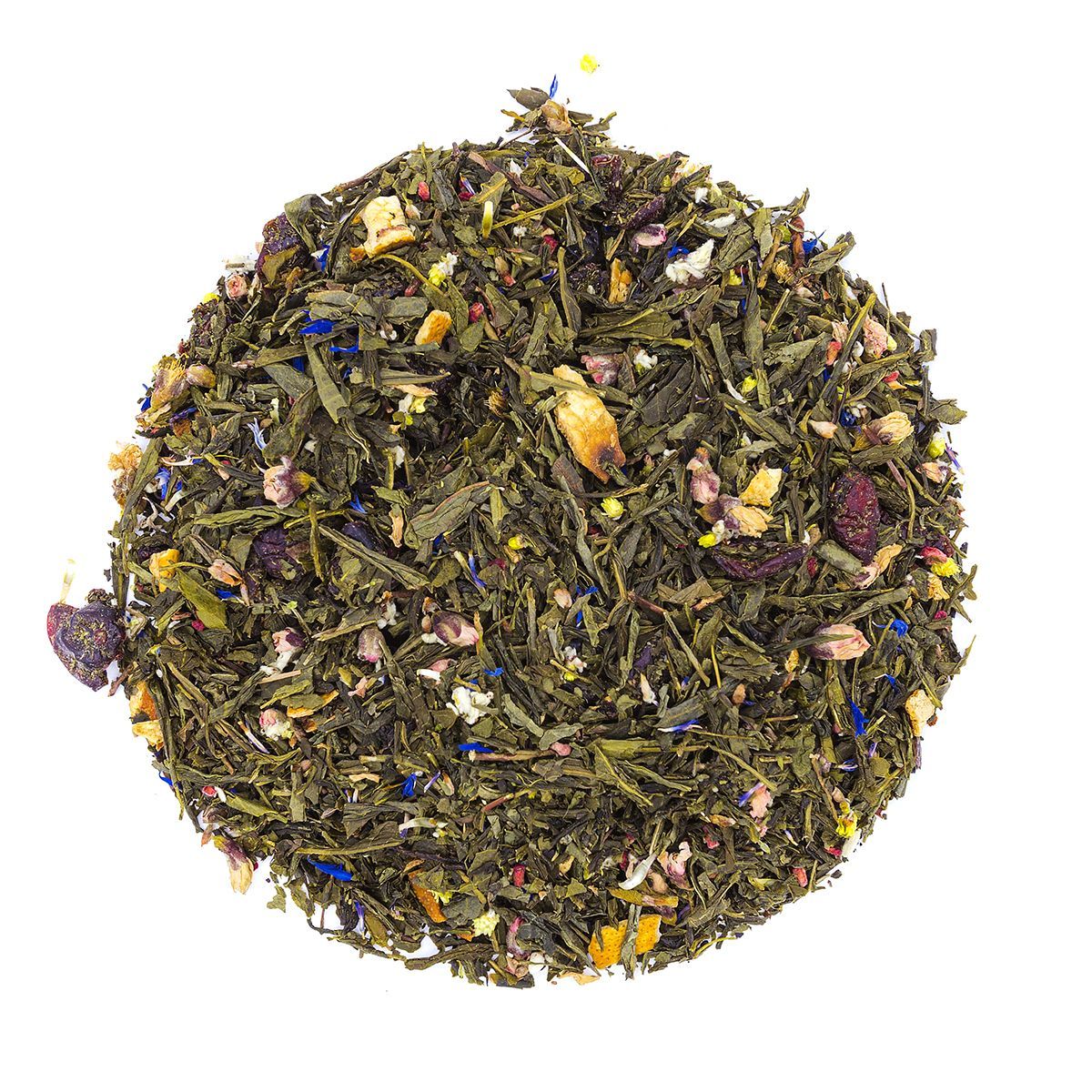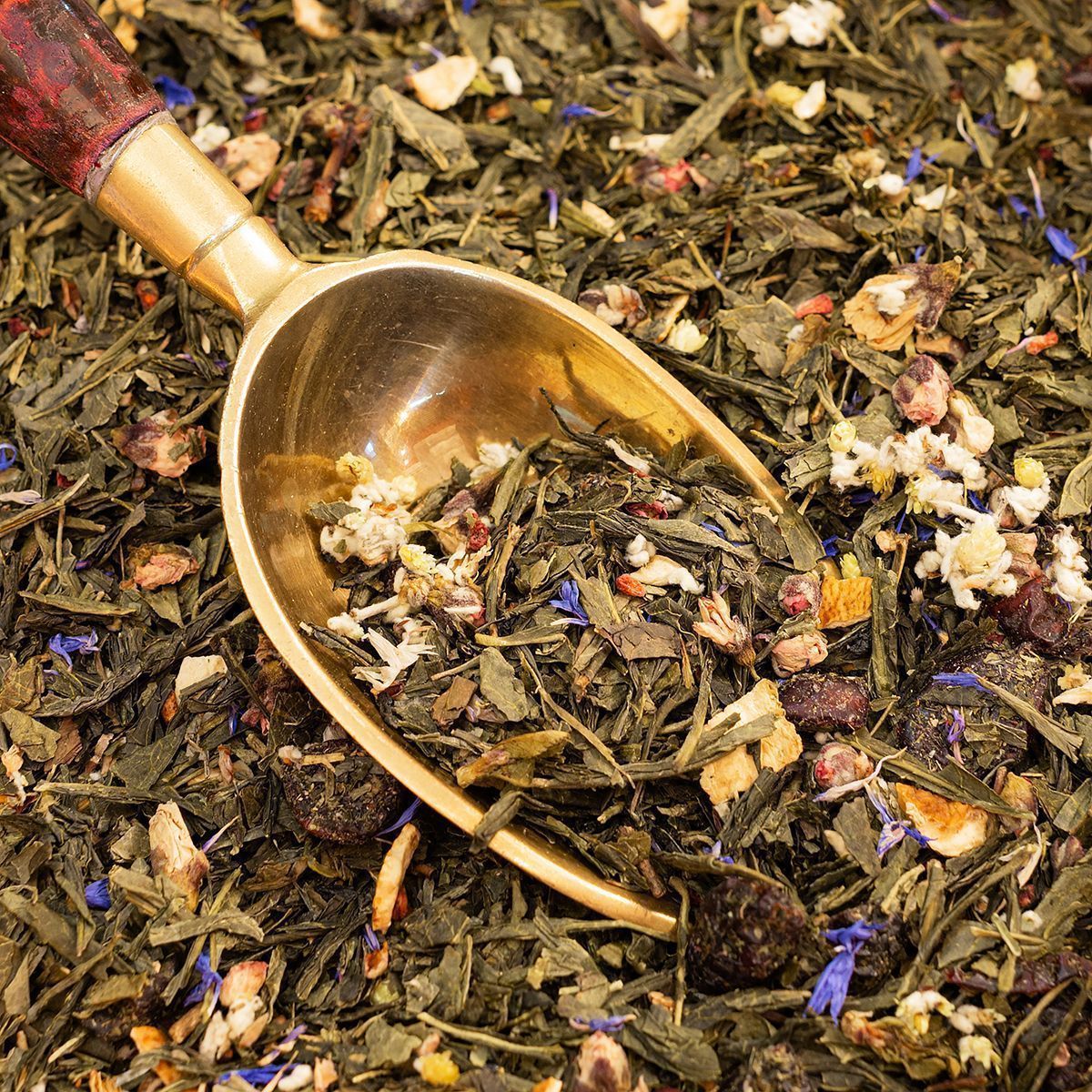 У чая «Клюква и грейпфрут» необыкновенно красивый внешний вид: сочно зеленые листы Сенчи оттеняют яркие ягоды клюквы, малины и янтарные кусочки грейпфрута, дополненные разноцветными лепестками василька, персика и бессмертника.
