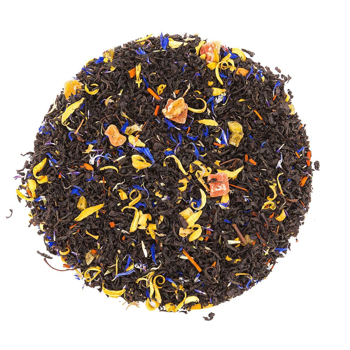 Состав купажа: индийский черный чай Ассам, папайя, манго, цветы апельсинового и сандалового дерева, синий василек.