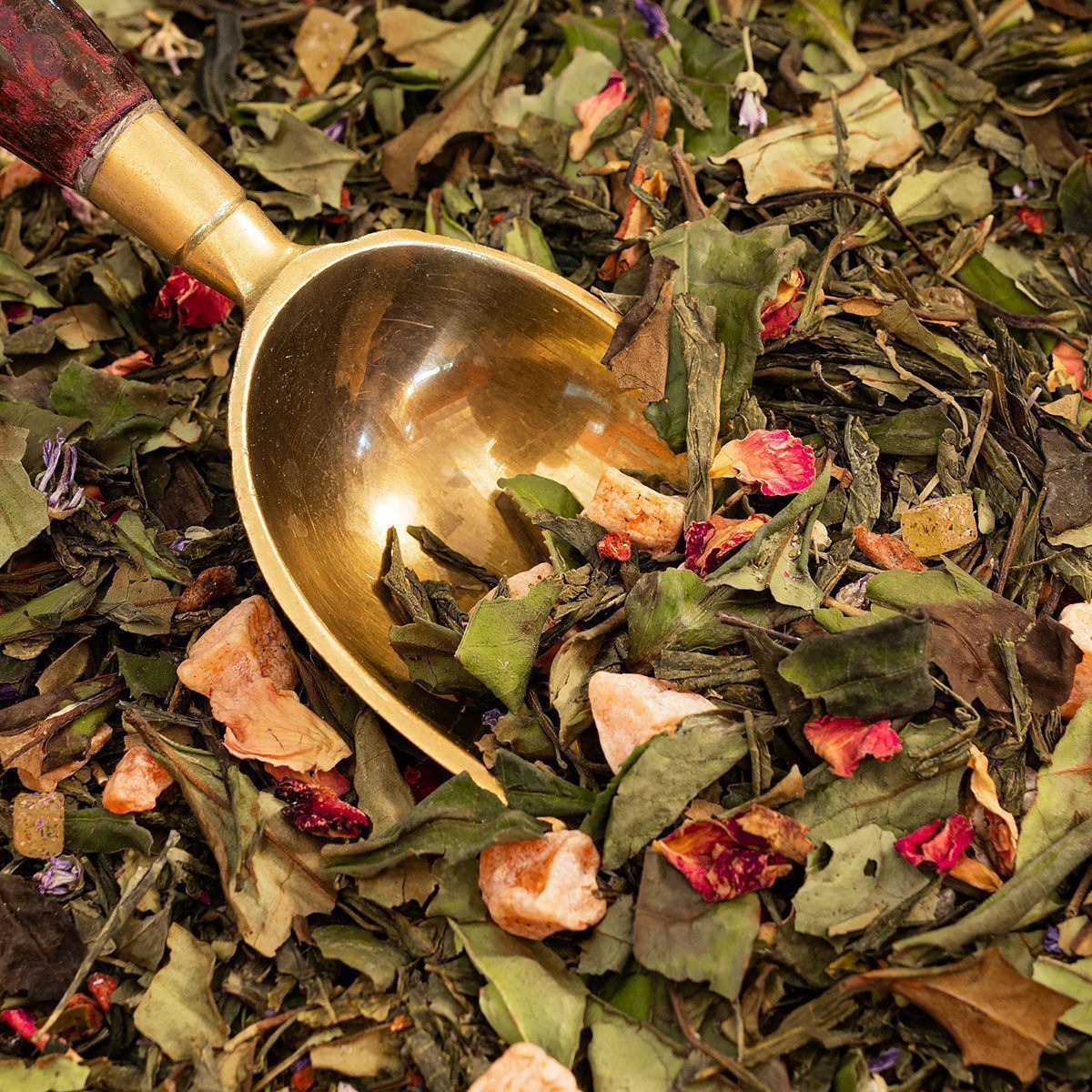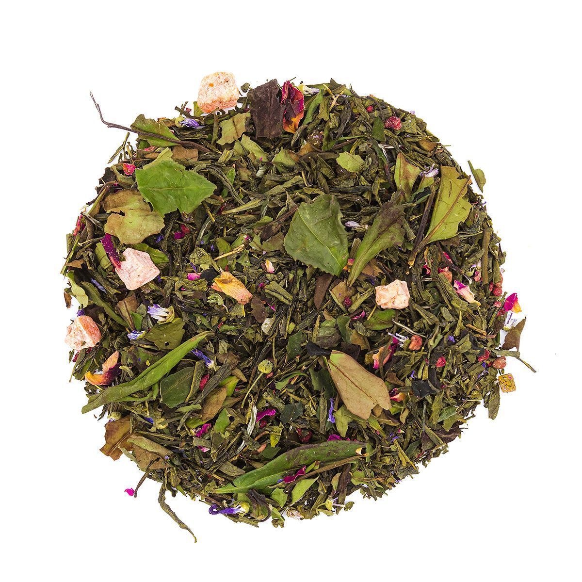 Чай не только обладает невероятно нежным, сладковатым вкусом и ароматом тропических фруктов, но ещё и прекрасен на вид! Яркая зелень сенчи, крупные темные листья белого чая, похожие на лепестки пиона, крупные кусочки фруктов, фрагменты ягод, а завершающий штрих на этой картине - нежнейшие цветы мальвы и лепестки роз.
