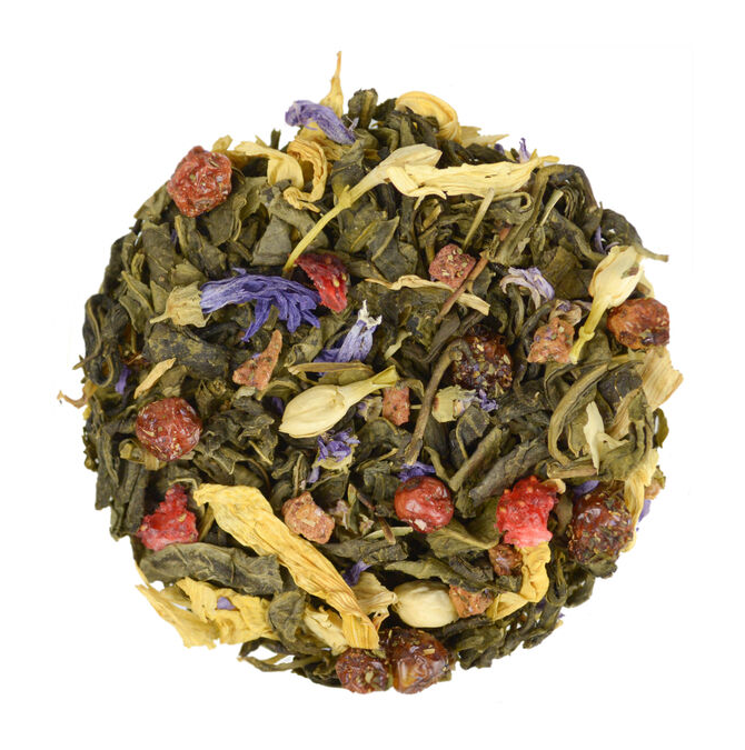 Китайский зелёный чай с бутонами жасмина, цветами мальвы, лепестками подсолнечника, кусочками клубники и красной смородиной. Купаж обладает цветочно-ягодным ароматом и сладковатым вкусом с ягодными нотами.