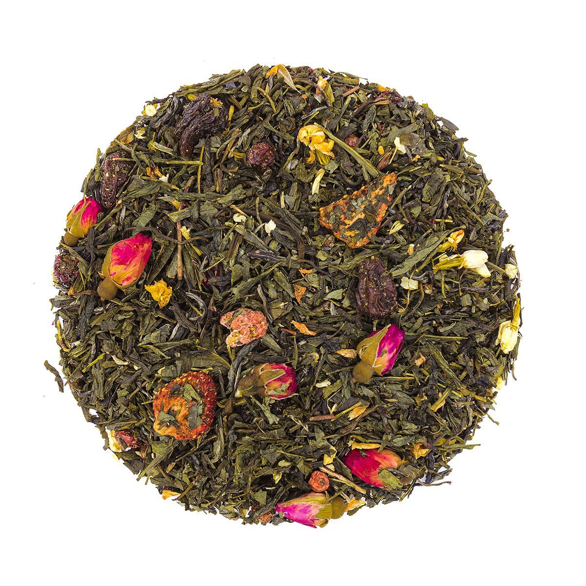 Зеленый чай с цветами жасмина, ягоды ежевики, лакричник, кусочки земляники и цветы подсолничника. Такая нежная цветочно-ягодная смесь обладает неповторимым букетом вкусов и ароматов. Изысканность жасмина, кислинка ежевики, сладость клубники и лакричника создают неповторимую атмосферу возвышенности, но в то же время, уюта и легкого настроения.