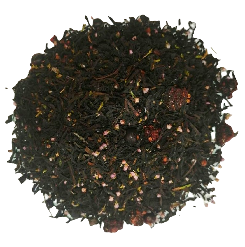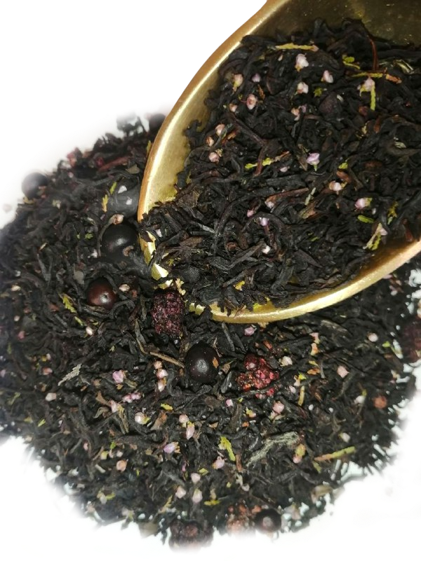 Чёрный чай с ягодами ежевики и можжевельника, украшенй цветами вереска. Напиток обладает ароматом с горьковато-медовыми и ягодными нотами и терпким кисло-сладким вкусом лесных ягод. Заваривать 3-4 минуты при температуре воды 95С. 1 ч.л. чая на 150 мл воды.